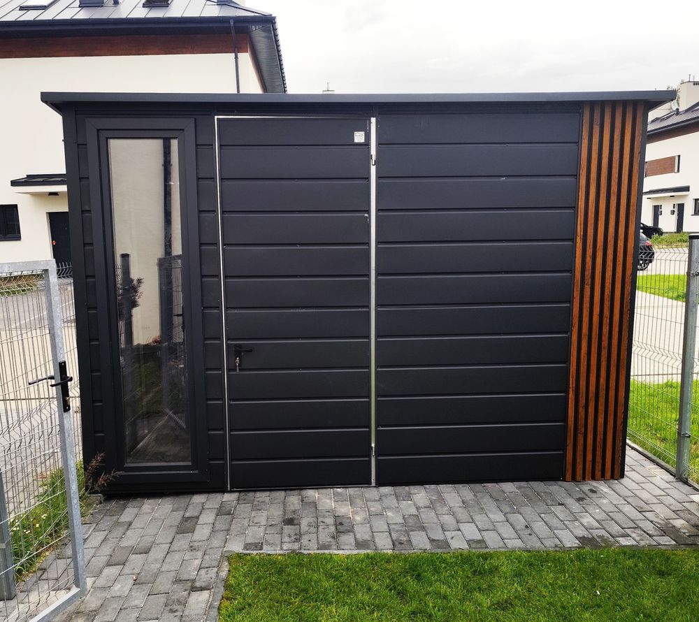 Nowoczesny domek narzędziowy o wymiarach 3 × 2,5 m w kolorze antracytowym, wzbogacony o eleganckie lamele w wykończeniu drewnopodobnym o szerokości 50 cm.