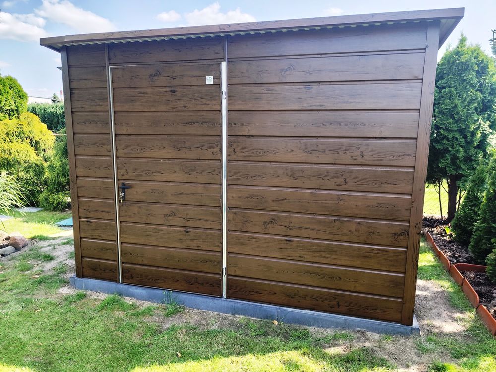 Elegancki domek ogrodowy o wymiarach 3 × 2 m wykonany w nowoczesnym wykończeniu drewnopodobnym. Dzięki poziomym panelom konstrukcja wygląda bardzo naturalnie i świetnie komponuje się z zielenią ogrodu — przypominając drewnianą altanę, przy zachowaniu trwałości stalowej zabudowy.