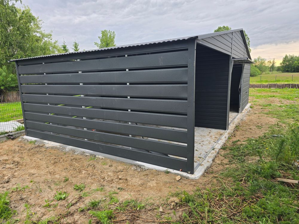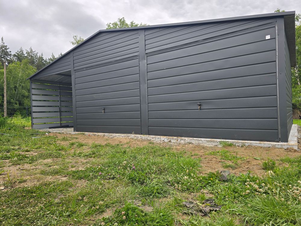 Garaj spațios din oțel cu dimensiunile de 6 × 5 m, extins cu o copertină de 3 × 5 m închisă cu panouri. Este o soluție foarte practică, care combină spațiul de garaj închis cu o zonă de utilizare acoperită — ideală pentru un autoturism, echipamente, lemne de foc sau o zonă de lucru.